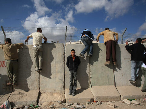 Palestinians climb the controversial Israeli separation wall as they try to bypass the Al-Ram checkpoint, on the edge of Jerusalem, after Israeli soldiers prevented them from entering Jerusalem to pray at the Al-Aqsa mosque on the last Friday of the holy month of Ramadan, 20 October 2006. (MaanImages/Moamar Awad)