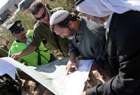Israeli soldiers explain the route of Israel’s separation wall to angry Jewish settlers who wish to annex further West Bank land into their settlement of Efrata near the West Bank city of Bethlehem, 9 November 2006. (MaanImages/Magnus Johansson)