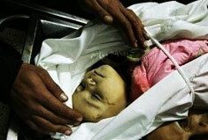 The terrified family had only walked a few hundred meters down a back lane before Israeli snipers began shooting at them, hitting one-year-old Farah in the abdomen. The girl, whose name means “joy,” didn’t immediately die, instead suffered for the next few hours, intestines falling out. Her mother, Shireen, breast-fed her in a desperate attempt to comfort the baby.