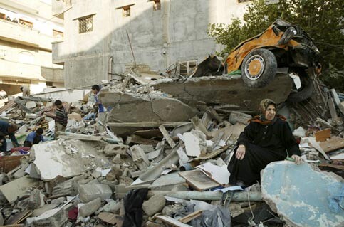 Palestinian woman sits on the rubble of her destroyed home in Brazil refugee camp (Johannes Abeling)