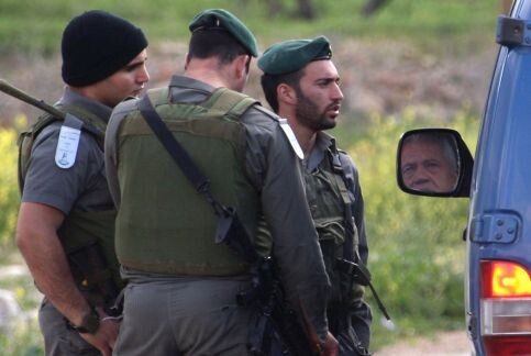 Israeli soldiers stop a Palestinian driver on the outskirts of Awarta village, 22 March. (Jafar Ashtiyeh/AFP)