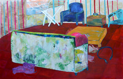 Al Mozain’s silent figure is transfigured in the subsequent canvases of “The Loud Silence” sequence. First he stands looking at the viewer, but in “The Loud Silence II” he disappears, referred to by the image of the fish hung on the wall of the salon occupied by two waiting women. They wait for the fish that the “hero” bears witness to in the first of the canvases.