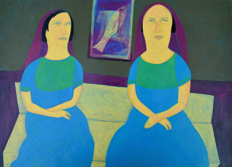 In these, the recurrent face becomes that of the mythological character. Turned from man into woman and back again, Tiresias, the blind prophet, embodied multiple dualities as the man/woman made his/her way through a Greek world of myth, gods and creatures with the strange ability to understand the song of birds. In his canvases, Al Mozain plays with the elements of the myth by painting full-figured women, birds on shoulders and thick black mustaches on their faces.
