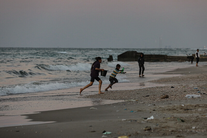 Displaced Palestinians gather on the beach in Deir al-Balah in the central Gaza Strip, 29 November 2023, during the truce between Israel and Hamas.