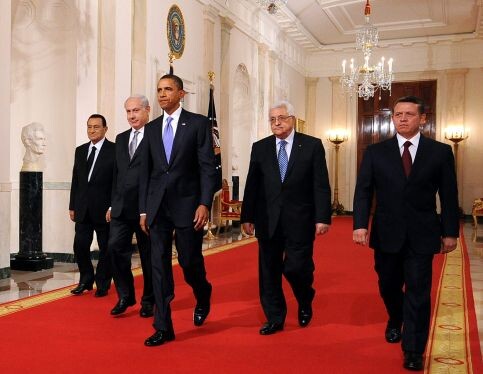 From left to right: Egyptian President Hosni Mubarak, Israeli Prime Minister Benjamin Netanyahu, US President Barack Obama, Palestinian Authority President Mahmoud Abbas and Jordan’s King Abdullah at the White House on 1 September 2010. (AFP)