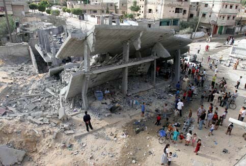 Palestinians inspect a building destroyed in the early morning by an Israeli air strike in Khan Younis refugee camp, southern Gaza Strip, July 28, 2006. (MaanImages/Hatem Omar)