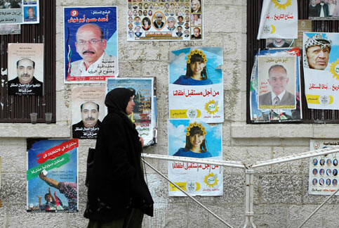 Posters of different electoral lists running for the Palestinian Legislative Elections are stuck in the streets at the West Bank town of Ramallah January 4, 2006. (MAANnews/Charlotte de Bellabre)