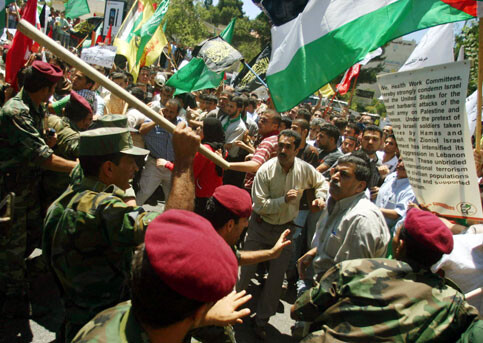 Palestinian security officers scuffle with Palestinian demonstrators in the West Bank city of Ramallah during a protest against the visit of the U.S. Secretary of State, Condoleezza Rice, to the Palestinian President Mahmoud Abbas, 25 July 2006. (MaanImages/Fadi Arouri)