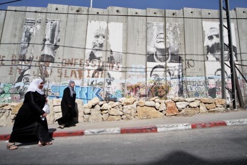 Palestinian women walk past Israel’s wall in the West Bank. (Luay Sababa/MaanImages)