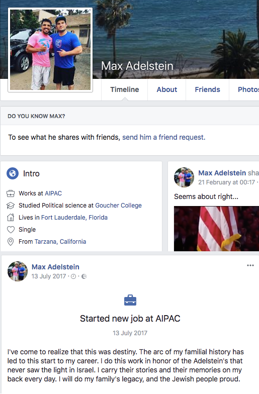 Adelstein now says he works for AIPAC, Washington’s most powerful Israel lobby group whose annual conference began Sunday. (Shortly after this article was published, Adelstein switched on his Facebook privacy settings and removed mention of his AIPAC role. Screenshots of his profile have been added.)