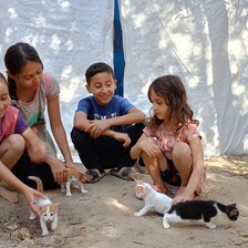 Antar and Smurfette are thus telling a story that is all too familiar to children in Gaza: displacement, living in a tent, waiting in long lines for water and food. The children in the audience listened closely to the puppets’ story, and most smiled throughout as they remembered how life used to be.