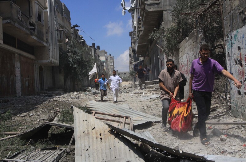 We couldn’t recognize Shujaiya. It was like a tsunami of bullets had struck the area. Or a blazing earthquake. Something natural but disastrous. But what really happened was beyond nature or even humanity. It was like the 1948 Nakba all over again, with scenes similar to the 1982 Sabra and Shatila massacre. There were flashbacks to the Cast Lead massacre of five-and-a-half years ago, too.