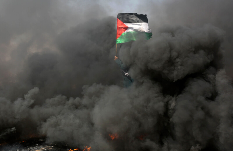 A protestor waves the Palestinian flag during Great March of Return demonstrations near Khan Younis on 11 May.