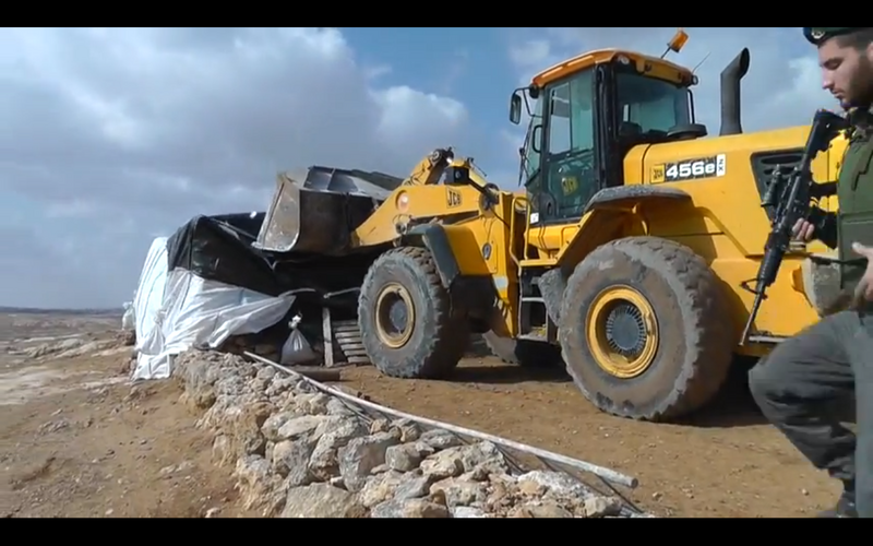 Video screenshot shows JCB machine demolishing Palestinian property in occupied Umm Fagarah on 24 November.