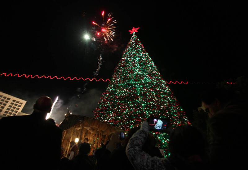 Palestinians celebrate the lighting of the Christmas tree in Manger Square outside the Church of the Nativity in the West Bank town of Bethlehem, 15 December.