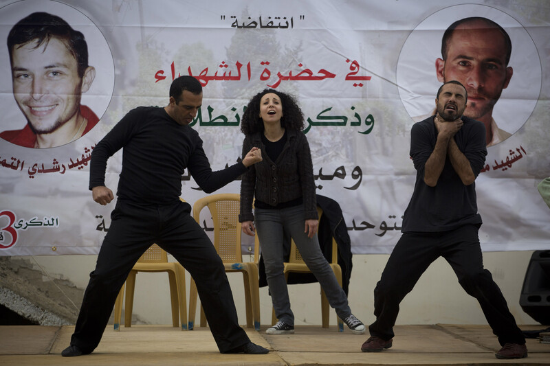 Members of the Freedom Theater perform during a memorial event for Mustafa and Rushdi Tamimi in the West Bank village of Nabi Saleh, 7 December. The event was held to mark a year since the killing of Mustafa Tamimi, who was shot in the face with a tear gas canister at close range by Israeli soldiers. Rushdi Tamimi was shot with live ammunition during a Gaza solidarity protest in the village the previous month and died a few days later. Those responsible for the deaths of the two have still not been brought to justice.