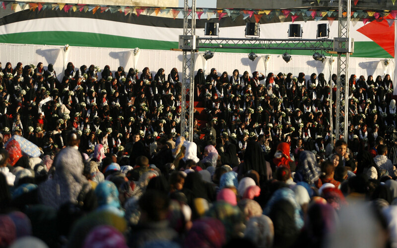 Palestinian brides during a mass wedding ceremony in Rafah, southern Gaza Strip, 19 December. The event was organized for Palestinian couples who are unable to afford a wedding.