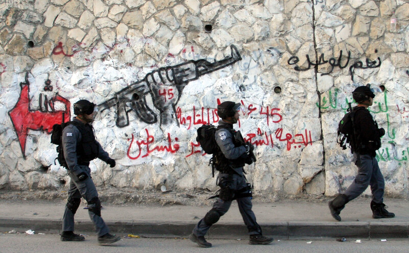 Israeli soldiers walk past graffiti during clashes with Palestinians in the East Jerusalem neighborhood of Issawiya after a demonstration in solidarity with Palestinian prisoner Samer Issawi, who comes from the village and has been on extended hunger strike, 19 December.