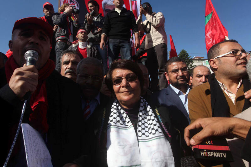 Palestinian resistance icon Leila Khaled, who lives in exile, participates in a Gaza City rally organized by the Popular Front for the Liberation of Palestine to celebrate the 45th anniversary of its founding, 6 December.