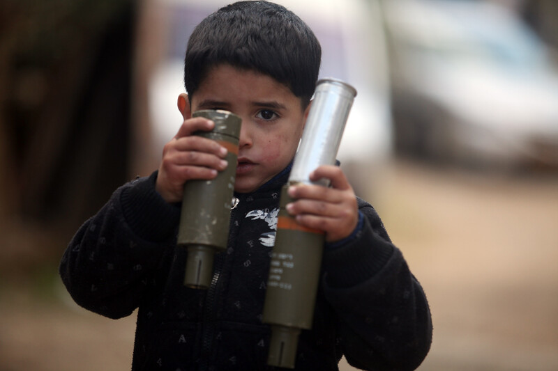 A Palestinian boy carries empty tear gas canisters after an Israeli military incursion to village of Beit Liqya near the West Bank city of Ramallah, 10 December.