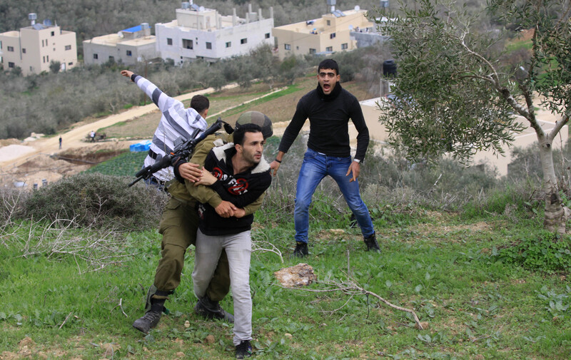 An Israeli soldier detains a Palestinian farmer from the northern West Bank village of Madama during the same confrontation with Israeli settlers photographed above.