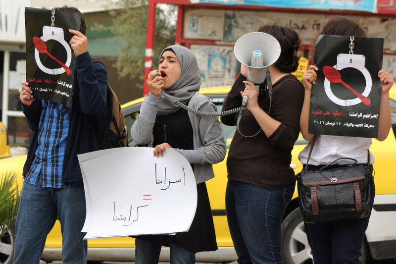 Demonstrators in Nablus carry posters with Hafez Omar’s designs in support of hunger strikers, April 2012.