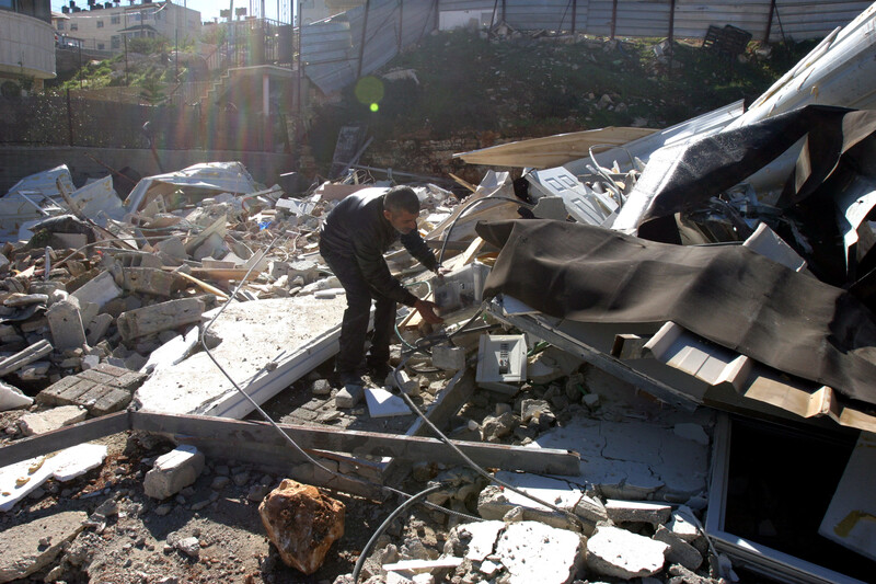 A Palestinian man searches through the rubble of his home in Beit Hanina, Jerusalem, after it was demolished by Israeli forces. February, 2013.