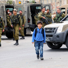 Actors potray Israeli soldiers attacking Palestinian children during a celebration of the second anniversary of the popular struggle against the occupation in the northern West Bank village of Kufr Qaddum, 4 July. There have been regular demonstrations against the blocking of the main road linking the village to Nablus.