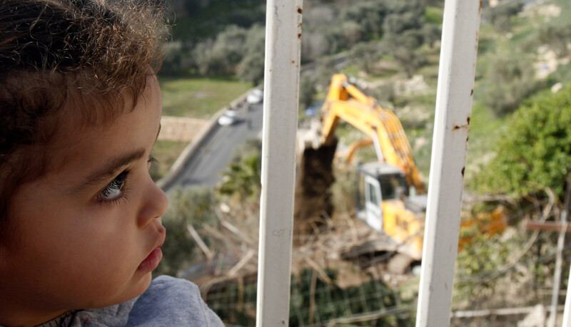 A Palestinian child watches as an Israeli bulldozer demolishes a Palestinian house in occupied Jerusalem’s Silwan neighborhood on 28 January 2013.