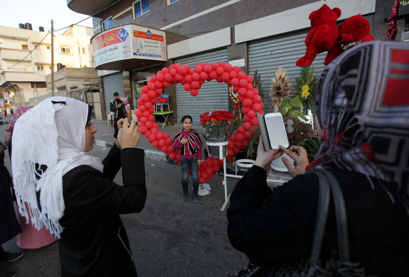 In Gaza City yesterday, many such stores were decorated with red objects like flowers, gifts and toys.