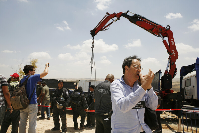 Activist and historian Gadi Algazi receives news of the new appeal filed by the village’s lawyer to halt the demolition. Police refuse to stop operations while the district court in Ramle convenes.