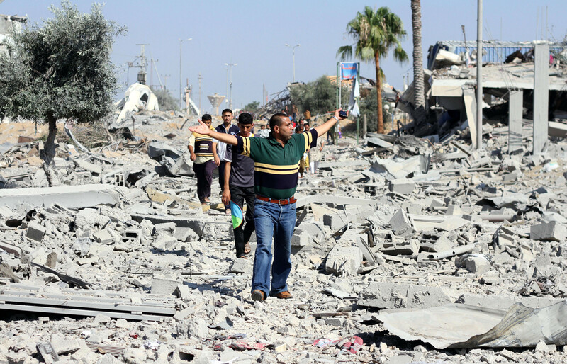 Palestinians walk past houses destroyed by Israeli airstrikes and shelling in Khuzaa, 3 August.
