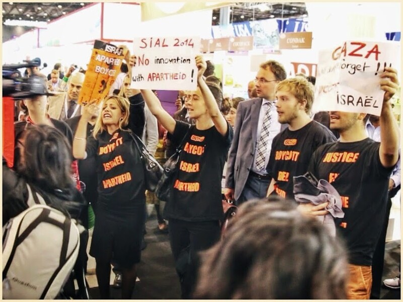 « Ce mardi des activistes ont occupé le pavillon israélien au salon professionnel de Paris condamnant les abus israéliens des droits palestiniens et chantant des slogans incluant : "Pas de commerce avec l'apartheid," "Boycottez l'apartheid israélien" et "Gaza, Gaza, nous n'oublierons pas ! »