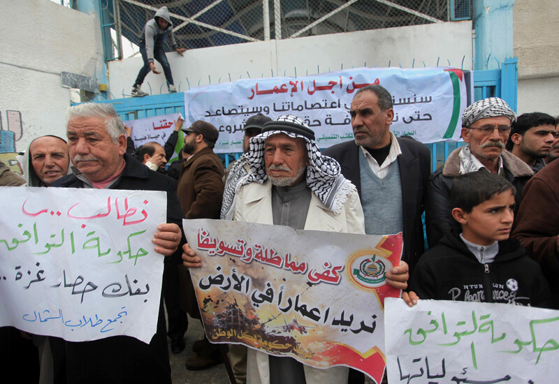 Palestinians whose houses were destroyed during Israel’s summer assault rally in front of UNRWA headquarters in Gaza City to demand reconstruction, 23 February.