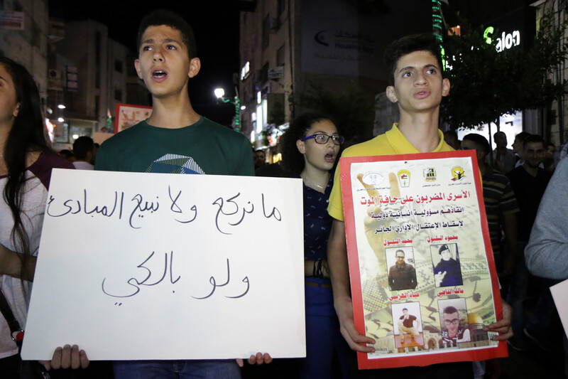 Palestinians rally in support of hunger-striking prisoners held by Israel, in the occupied West Bank city of Ramallah, on 11 September.
