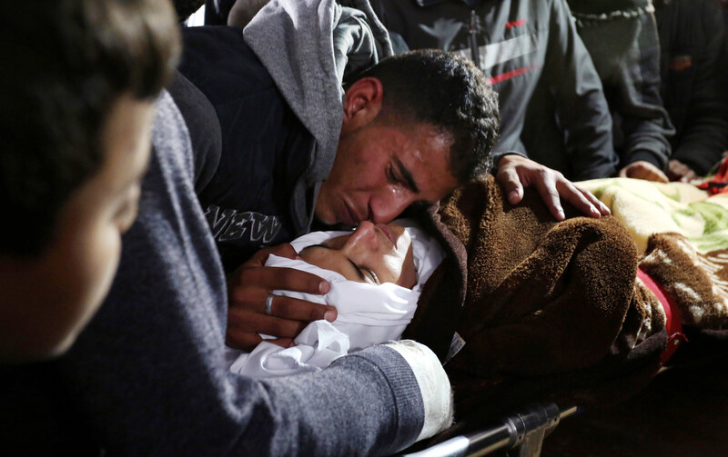 Palestinians mourn over the body of Obeid Sufi, 25, during his funeral in Rafah, southern Gaza Strip, on 25 February. Sufi was among three workers who died after inhaling poisonous gas inside a tunnel under the border between Gaza and Egypt.