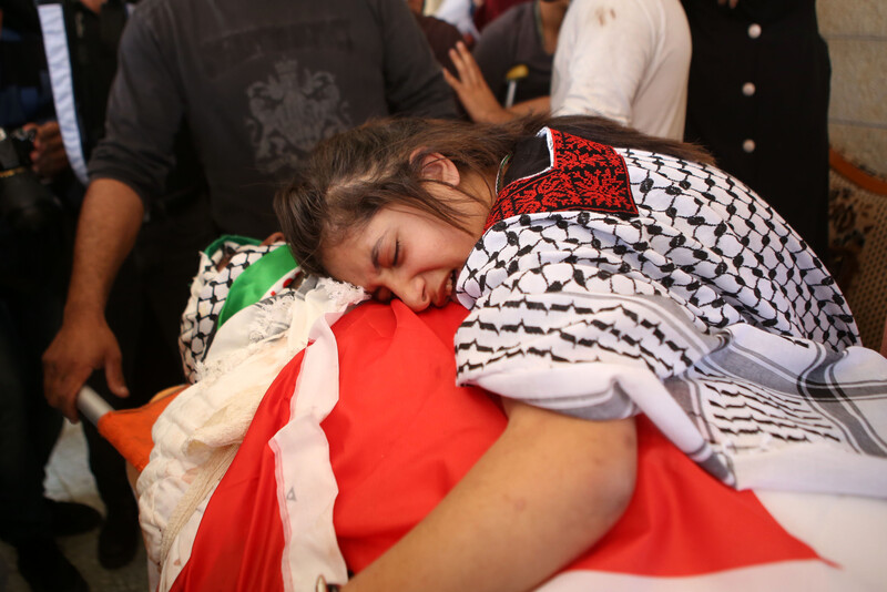 Sarah Shamasneh mourning over the body of her brother Muhammad Shamasneh during his funeral in Qatana, northwest of occupied Jerusalem, on 2 November 2015. Israeli forces recently arrested the 14-year-old and her mother Rusaila.