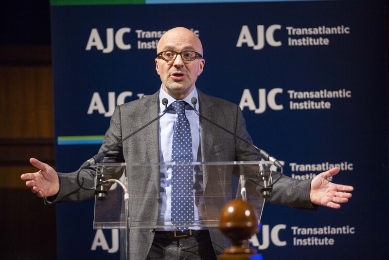 Daniel Schwammenthal, a leading lobbyist in Brussels, introduces Israeli politician Yair Lapid during a recent event. (AJC Transatlantic Institute)