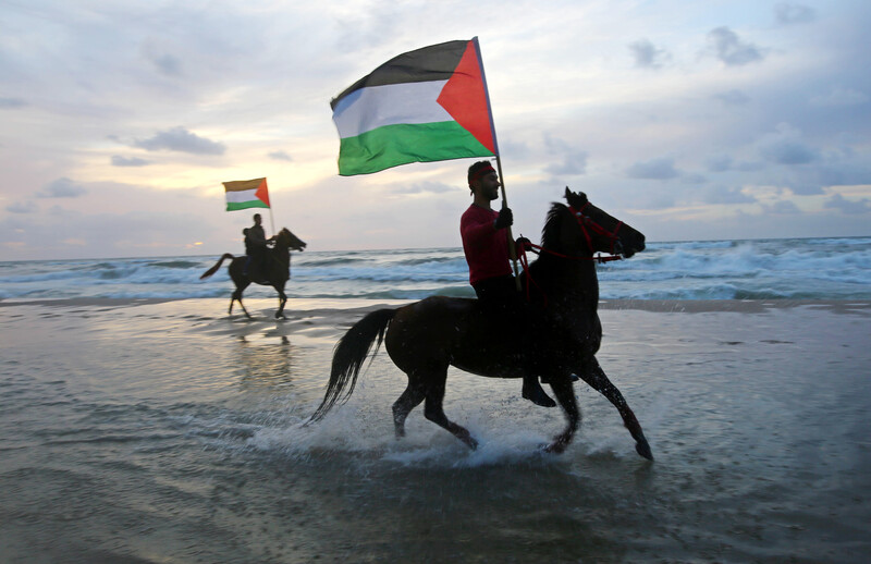 Palestinians perform during an equestrian show at the beach in Gaza City, 9 March.