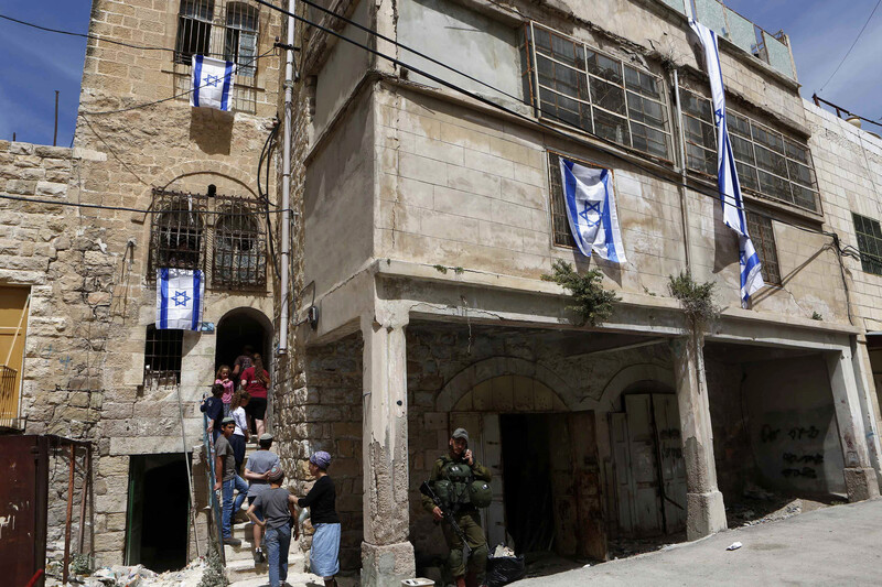 An Israeli soldier guards a family of Israeli settlers standing in front of a Palestinian home after they occupied the building near Hebron’s Ibrahimi mosque the previous night, 27 March.