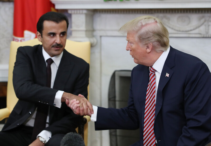 US President Donald Trump shakes hands with the Emir of Qatar Sheikh Tamim bin Hamad Al Thani, during a meeting in the Oval Office at the White House, on 10 April 2018.