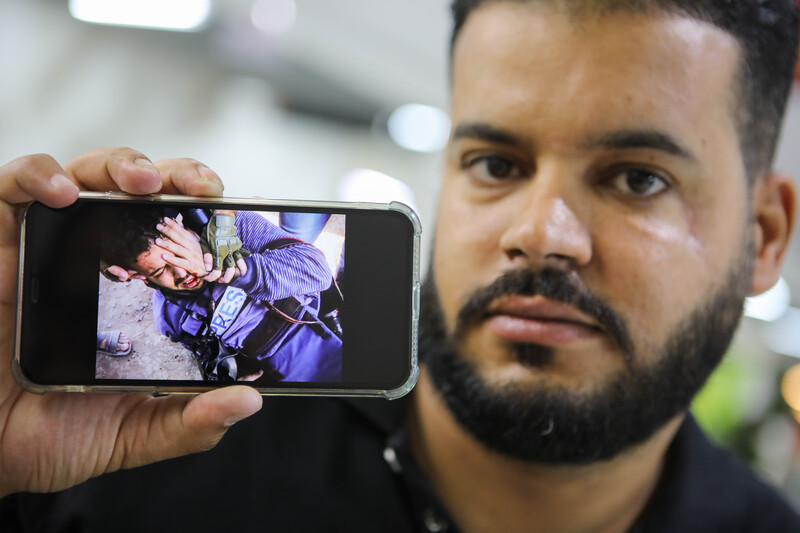 Atiah Darwish holds a cellphone with a photograph showing the moment he was injured by the Israeli military.