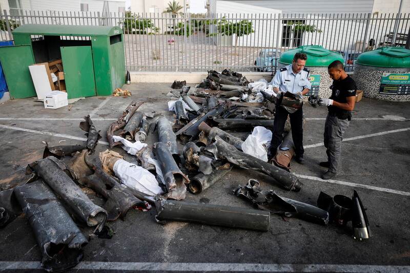 Israeli police spokesperson Micky Rosenfeld and a municipality security officer look at a collection of rockets fired from Gaza at a police station in Ashdod, 20 May.