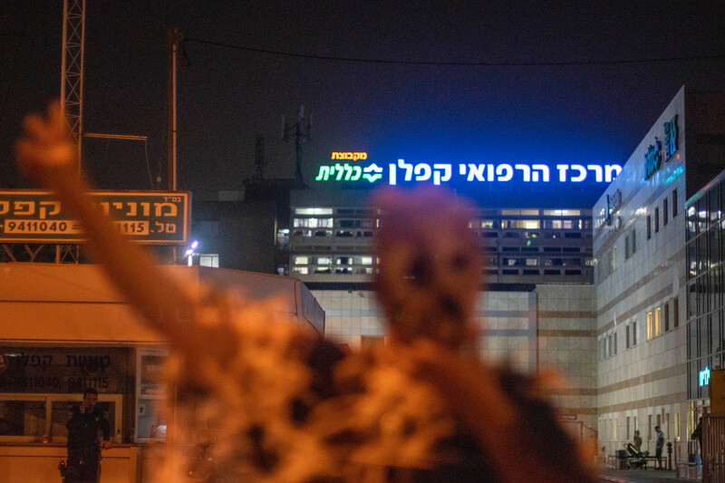 Protesters stand outside of Kaplan Medical Center in solidarity with Palestinian prisoners on hunger strike to protest being held without charge or trial by Israel, 14 October. Miqdad al-Qawasmi was admitted to Kaplan’s intensive care unit after more than 100 days of hunger strike during October.