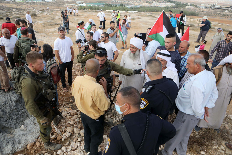 Palestinians and Israeli activists protest against Israeli land confiscation and the cutting of the water supply to Palestinian villages south of the West Bank city of Hebron on 2 October.