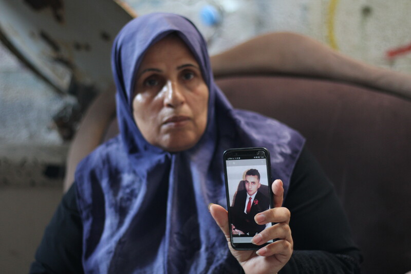 Jameela Abu Arabiya holds up a photo of her son Hosni, 25, who died by suicide in Gaza in July 2022.