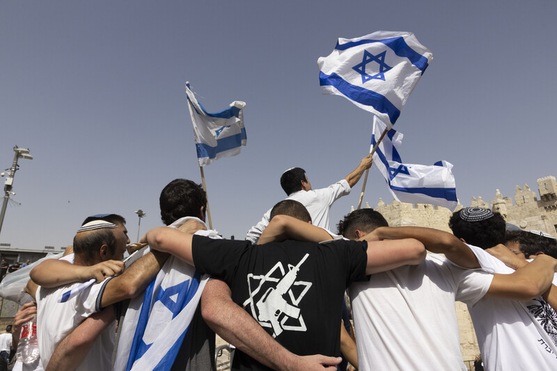 Israeli settlers, chanting against Palestinians, march through Damascus gate into the Muslim quarter of the Old City of Jerusalem during the an annual Flag March, 29 May 2022.