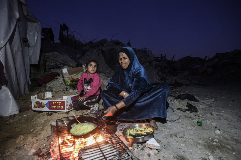A mother cooks over an open fire amid the rubble of Jabaliya refugee camp in Gaza’s north. (Omar Ashtawy / APA Images)