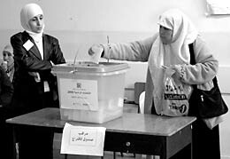 A Palestinian woman votes, while another observes, at a polling station in central Ramallah. (Photo: Rob Maguire)