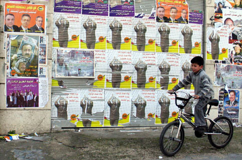 A Palestinian boy passes by a building covered with electoral posters of different electoral lists running for the Palestinian Legislative Elections in the West bank city of Nablus January 22, 2006. (MAANnews/Rami Swidan)